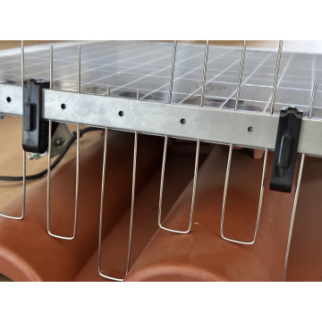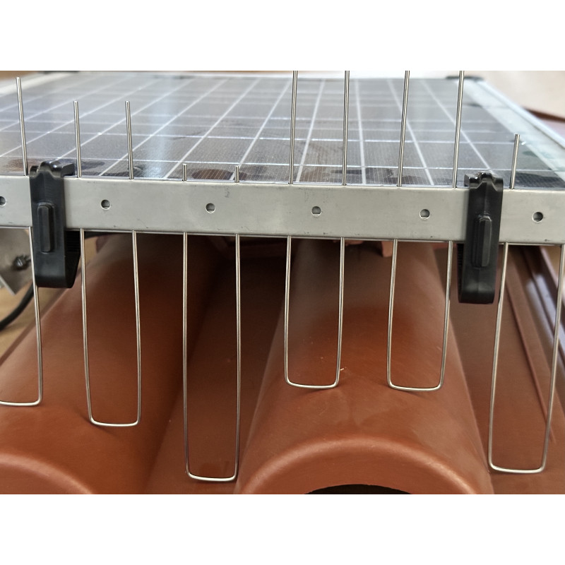 Montaggio: La parte rigida del dissuasore può essere incollata con silicone a presa rapida e/o biadesivo e/o fissata con viti/rivetti direttamente nella cornice del pannello avendo cura di stare nella parte più bassa possibile per evitare il rischio di andare a rompere la cella del pannello; oppure con il kit VITE PER AGGANCIO (MC4870). Il prodotto può essere installato in entrambi i sensi, con le punte verso l’alto per una maggiore rigidità su piani lineari o verso il basso per una maggiore accuratezza nel seguire i contorni dei coppi ecc.